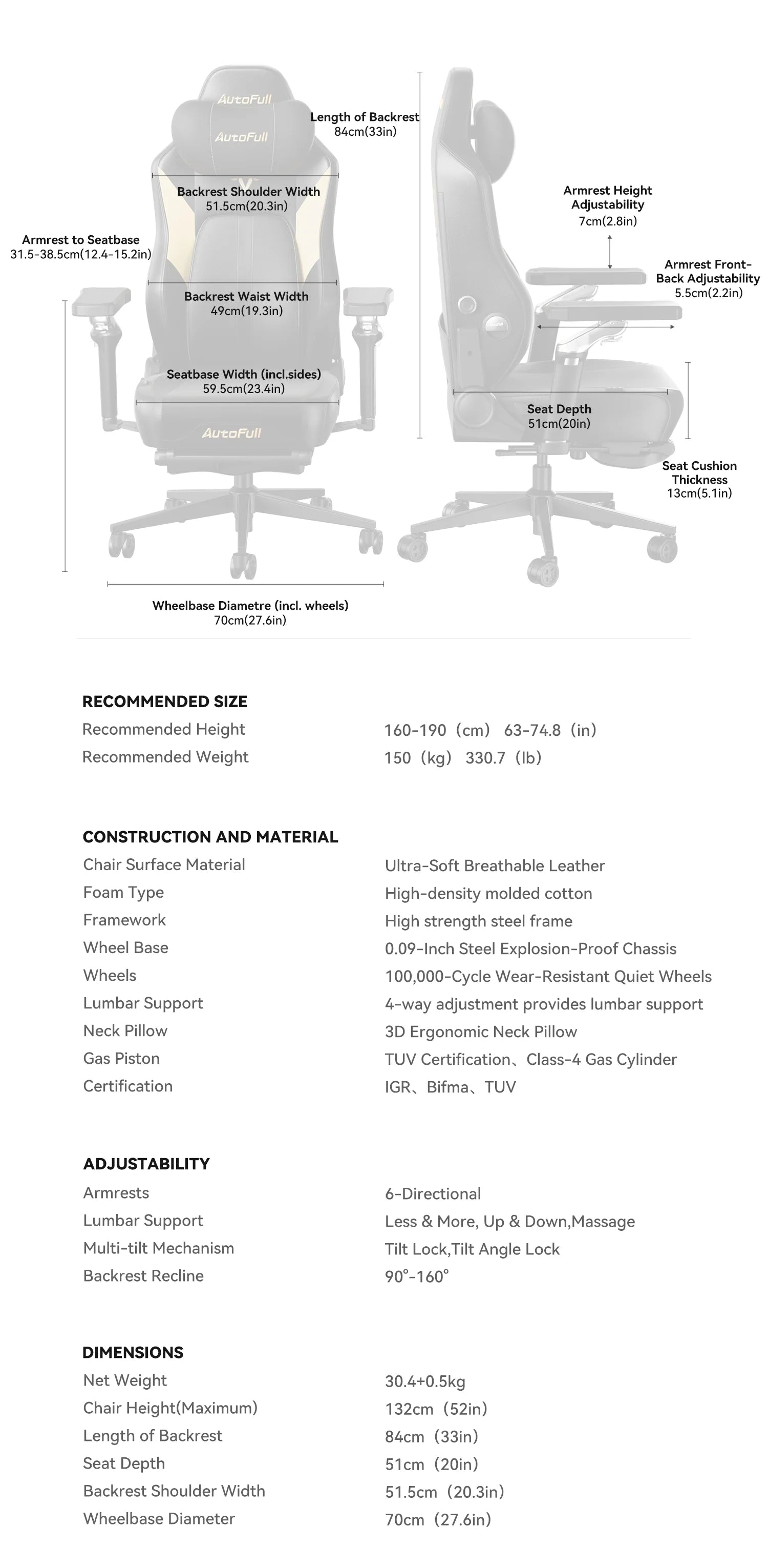 Ultimate Climate Comfort:Stay comfortable year-round with our advanced climate control system. Dual high-powered fans cool the seat to 66.2°F, keeping you dry and refreshed, while integrated graphite heating elements warm it up to 122°F for cozy relaxation. With a three-level adjustment, you can easily switch between cooling and heating modes to suit your needs—ensuring focus and comfort no matter the weather.Elastic Lumbar Massage:The lumbar support also includes a built-in massage feature with two high-frequency vibration motors to keep you relaxed and comfortable during long gaming or work sessions.Dynamic Tracking Lumbar Support:Achieve personalized support with our adaptive lumbar system, designed to move up, down, forward, and back to align with your spine perfectly. Ideal for users between 5'9" and 6'2", this lumbar cushion adjusts with a simple turn of the knob and provides ongoing support through its flexible design. Lock it into your preferred position with ease, ensuring long-term comfort during extended sessions.3D Erogonomic Neck Pillow:The newly designed fixed 3D headrest offers individual support adjustments on both sides, with a 60° angle of adjustment. It also provides orbital movement with 1.25 inches of forward and backward motion, along with 4 inches of vertical adjustment, delivering effective neck support for users between 5'3" and 6'4".360° Adjustable Armrests:Enjoy 360° rotation on the main shaft and 40° inward/outward adjustment on the secondary shaft. These armrests can be folded up by 20° and adjusted by 3.54 inches in height and 2.75 inches in depth, ensuring you find the perfect ergonomic position every time.