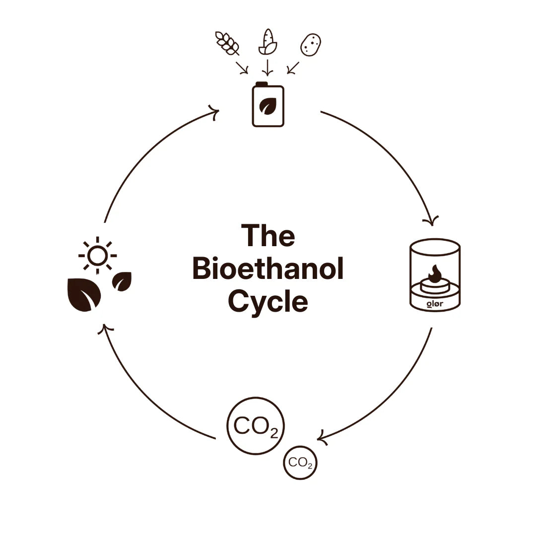 Bioethanol is made from renewable raw materials such as corn, potatoes, or grain. These plants absorb CO₂ from the atmosphere as they grow. Through fermentation and distillation, a clean, liquid fuel is created. During combustion, the previously stored CO₂ is released and absorbed again by new plants. This creates a natural cycle that makes bioethanol a particularly sustainable alternative.