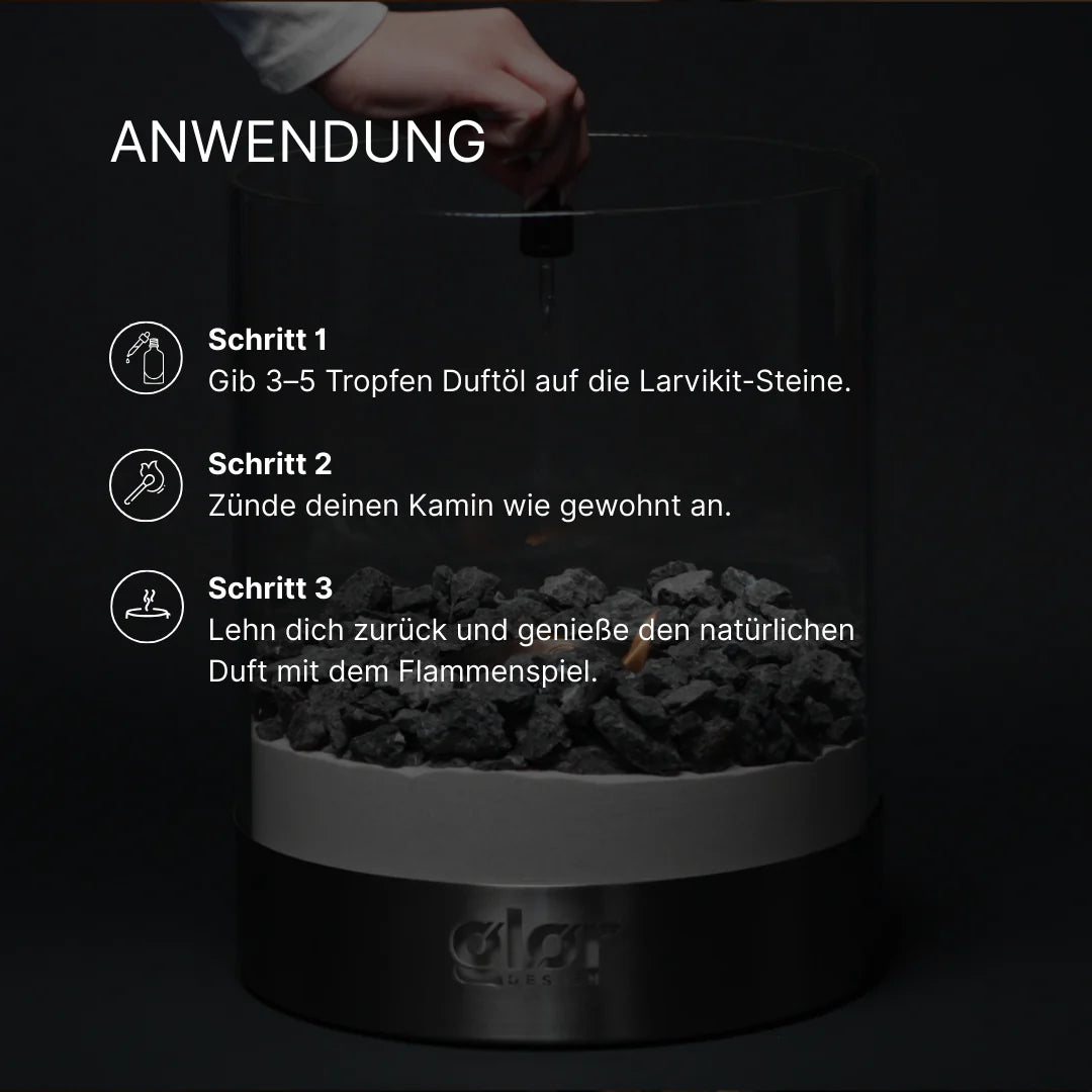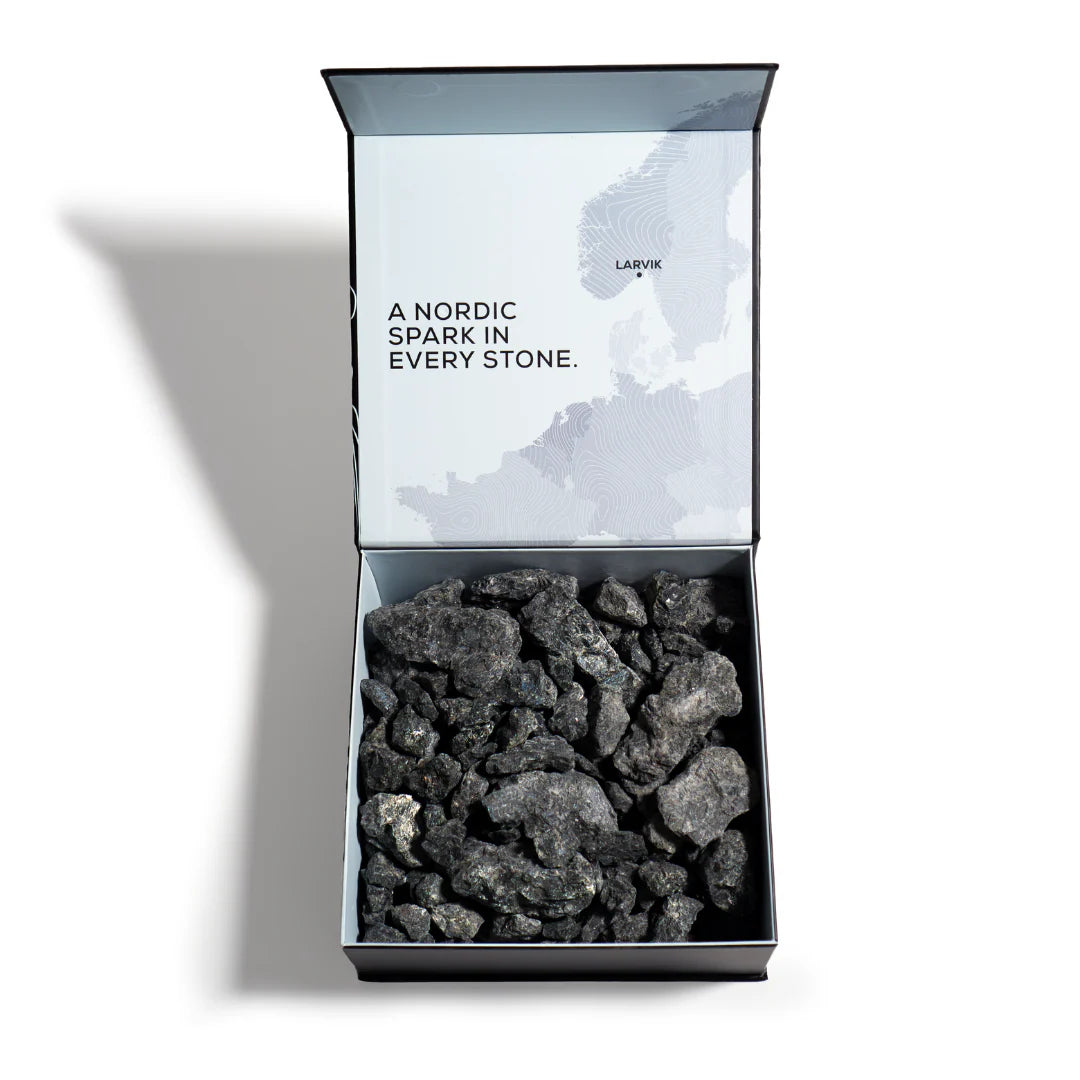 Each set includes hand-selected Norwegian Larvikite stones, known for their deep blue hues and shimmering silver reflections. These unique stones, found only at the southcoast of Norway, add a natural elegance to the flickering flames.