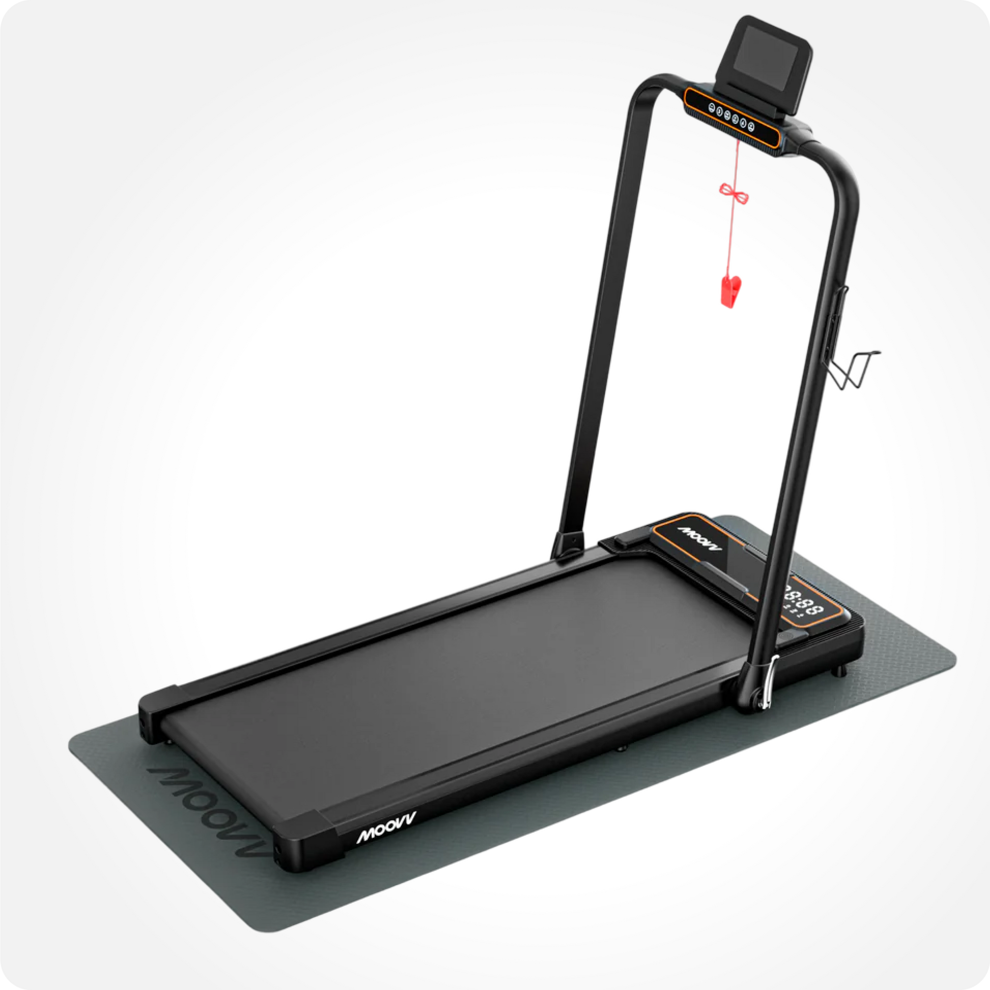 No bulky fitness equipment in your living room. The Moovv treadmill easily stores with its wheels on the bottom, directly under your sofa or bed.
