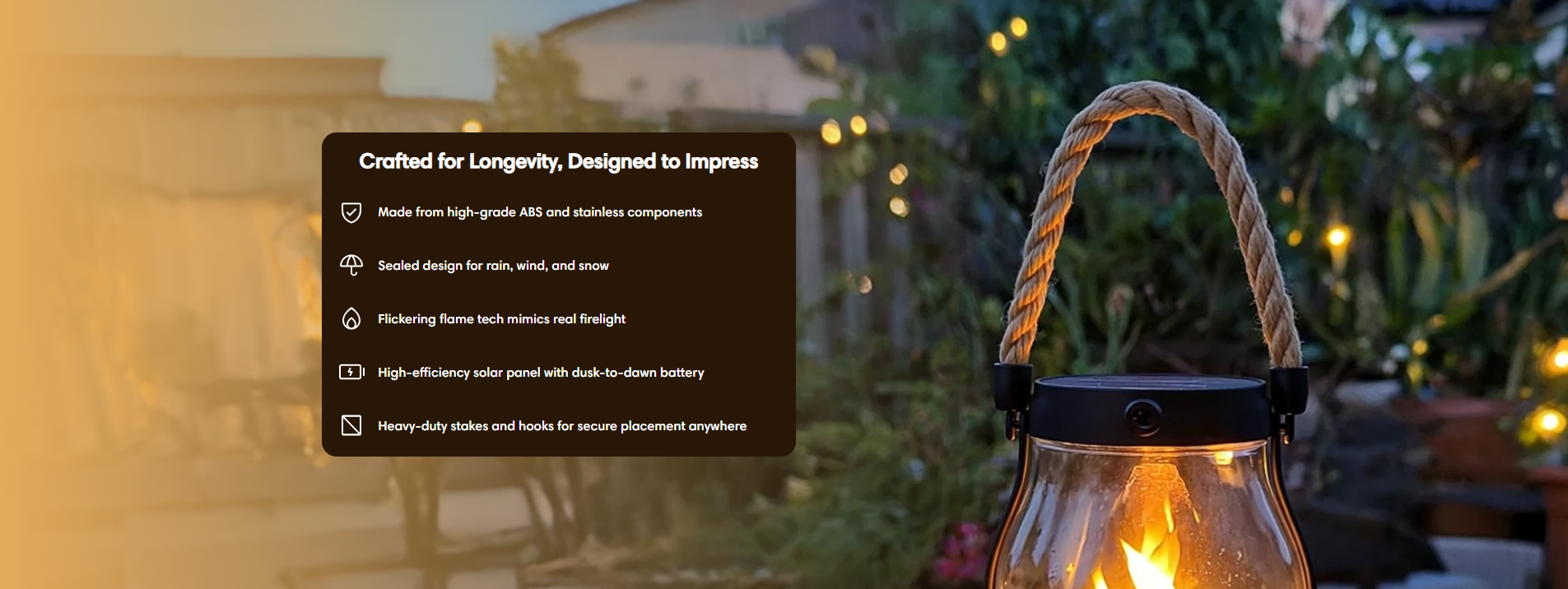 Designed for the outdoors, this solar lantern is fully waterproof and weatherproof. Whether it’s rain, wind, or moisture — it never quits. Leave it out. It’ll shine every time.